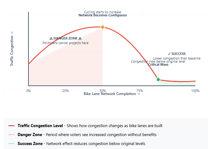 Overcoming this conundrum is difficult because of misaligned incentives. Politicians want to get re-elected, and listening to their voters is a pretty obvious way to increase the likelihood of that happening. And the particular voters who want to keep driving their cars and are frustrated by less lanes are not necessary wrong in the moment. They just don’t have enough information to know that if they were to tollerate the situation for 3-5 years, long enough for a contiguous bike lane network to be completed, things would improve. In fact, there would be even less congestion and more open roads for them to drive on, because enough other drivers would have decided to start cycling instead.